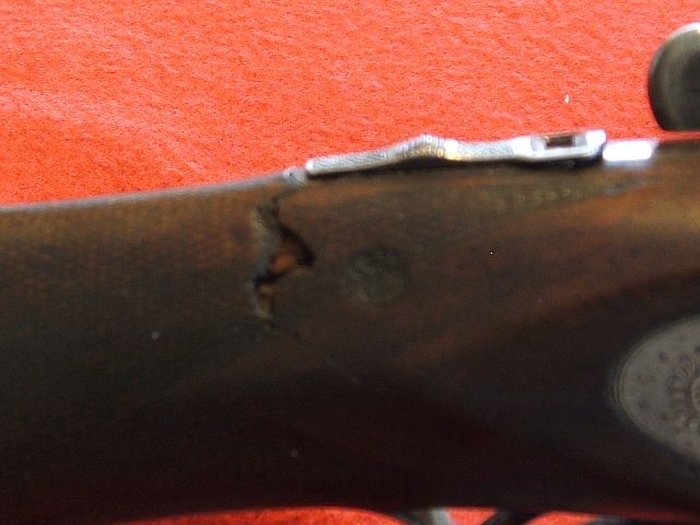 The serial number is 368xx. As I said above I don't think this gun is really worn in the area they usually wear(knuckle) as it still locks up tight and there's no sideplay. That crack is not thru so I expect the cost to fix the stock should be reasonable The best point IMO is the condition of the 120+ year old Damascus barrels and the fact that the gun is un-messed with as evidenced by the intact grip cap and original butt plate. I've made no attempt to clean this gun so I don't know what the wood pattern looks like. I missed picturing a few things so when the weather clears I'll take some more photos and post them. Jim