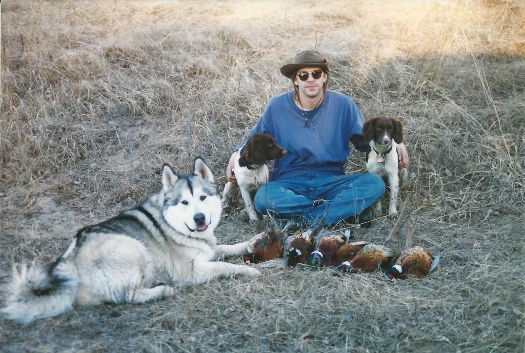 left to right, Crosby, Nikki, Myself and Maggie in about 1999. How many of you can say you have seen a malamute flush and retrieve a wild rooster?