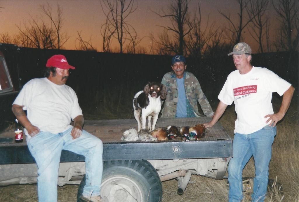 First trip to the Rez. We had no idea how much time we would come spend there and the special friendships and memories that would be to come. Left to right, My dear departed friend and guide Dwayne Ryan, Maggie, Mike (guides helper) and my dad enjoying a beautiful South Dakota sunset.