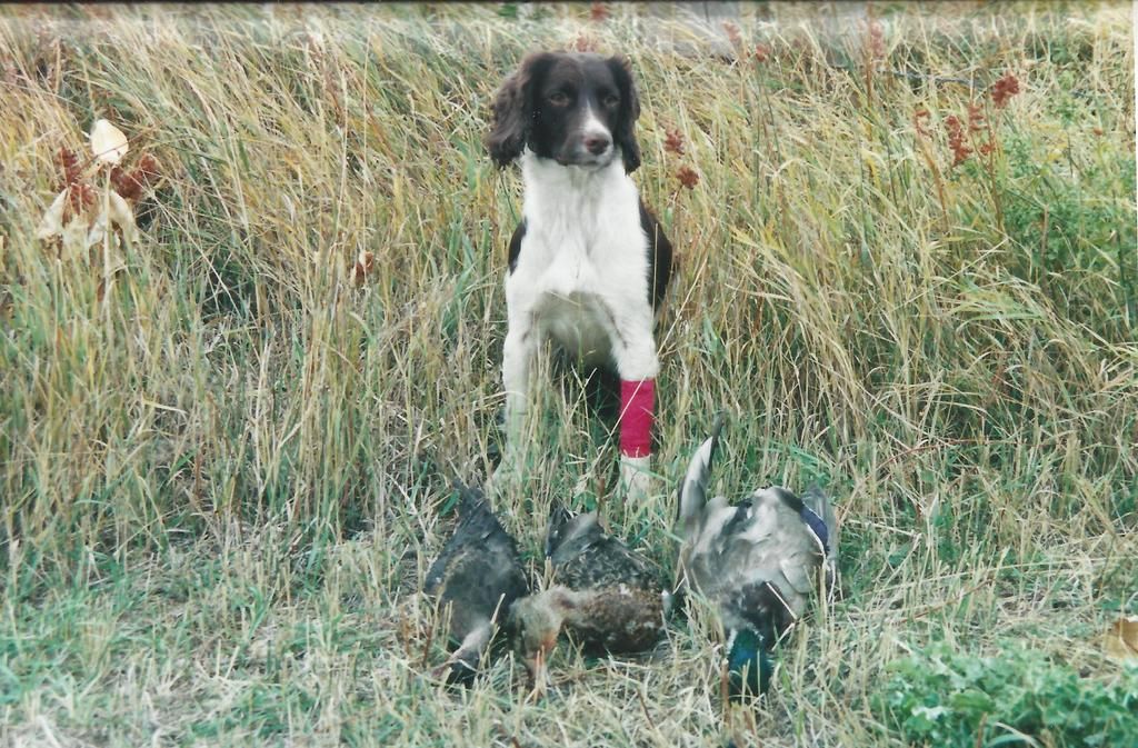 Wonderful pictures Eugene. I for one would love to see pictures from your driven shoots. My first trip to MT in the fall of 2001.  Standing on the bank of the Musselshell river and holding a Lefever G grade. How I ended up shooting the Lefever was one of those things you never forget. I had started the trip with a nice little Birmingham boxlock. Maggie flushed a rooster along the bank of the river, a right to left crosser and I nicely centered the bird in my pattern and it folded up in the air landing quite dead in the river. Maggie made a beautiful water retrieve and I was feeling pretty darn good about life. I proceeded to take less than a dozen steps, tripping on a hidden stick in the grass and cleanly snapping the wrist on the British gun. The walk back to the truck to get the Lefever was frustrating to say the least. Nothing like roosters flushing and your buttstock hanging by the rear trigger guard screw. Maggie was an all purpose dogs as well and this is my favorite picture of her. We shot very few Ducks together, maybe 2 dozen, but this picture captures her heart. No way was a few stitches going to stop her from finishing a hunt.