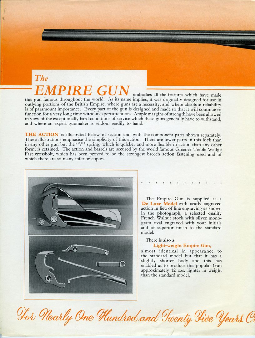 Hi Drew, I think Graham sees this as just examples and not a real identification. And it seems to me that EN32 is equivalent to 1016 low carbon steel. I added another poor picture of the gun. The gun has a long bar, Baker ejectors and bushed strikers (and of course, Greener bolt and safety) . I really like the Empire action as it is amazingly simple. Better than any other boxlock system I think. Using the main spring as a pushrod and ejector trip was a brilliant idea. And by the way I agree, the .360#2 is a great caliber. Enjoy! WC-