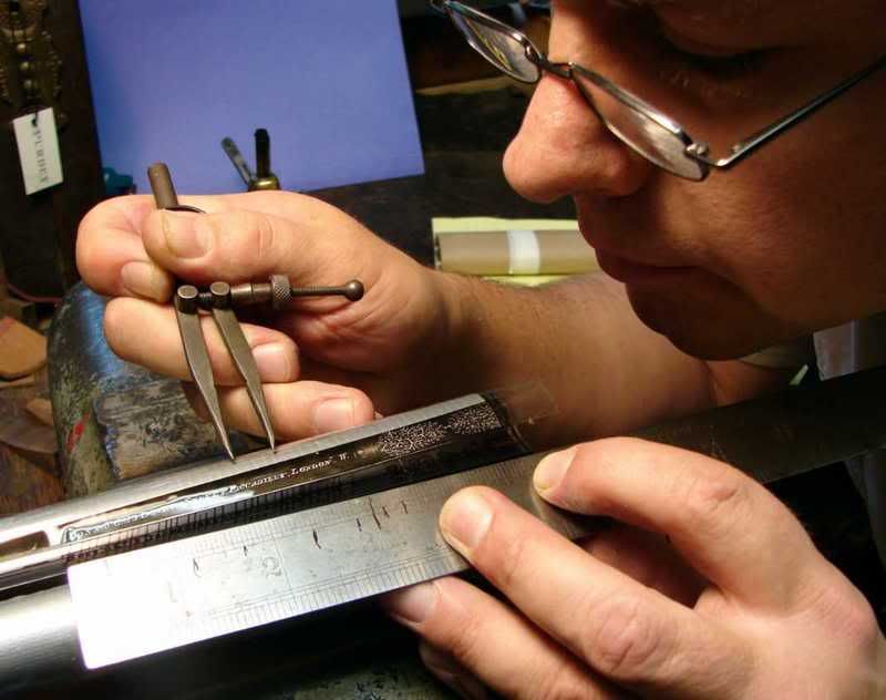 The layout for the lettering is measured carefully using a smoke pull from one Bbl to match up the layout for the new Mick Kelly bbls lettering for the other gun in the pair.