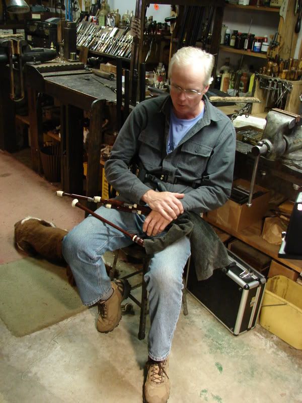 This is a picture of Mike Dow and his Irish bagpipes he built from scratch aftr a set he saw in a dusty old castle in The UK. He is an excellent woodcarver, and spent the afternoon entertaining us with the pipes as David and I worked on the pair. If you are into woodcarving he has a very interesting site http://www.archcarving.com.