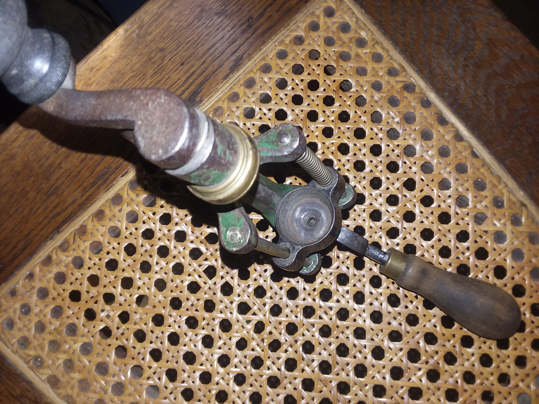 When Gil asked what prevents the shell from spinning in the roll crimper in my second photo yesterday, I didn't have a good answer. I knew it worked but I had never questioned that aspect of its' function. I got it back out when I got home this evening and looked closer. The black casting which holds the shell head is tapered inside. A 12 gauge shell doesn't actually touch the bottom. As you put pressure on the lever to advance the shell into the roll crimp head, there is nothing but friction of the shell rim being forced down into that taper that prevents the shell from rotating. I then put a 16 gauge shell into this tool and I think the base almost hit bottom, but there was still no lateral movement of the shell head in that tapered recess. Just for kicks, I advanced that shell into the crimp head and turned the handle. The shell still didn't rotate, but the 12 gauge roll crimping head didn't allow the smaller diameter case mouth to start rolling inward, and it started to roll outward instead. Reversing the handle unscrewed it from the crimp head, and the threads appeared to be 5/16" standard. It occurred to me that it wouldn't be hard to chuck a piece of brass into my Unimat or South Bend lathe and make another crimp head that would permit this tool to be used for 16 gauge as well. There is nothing on this tool to indicate what company produced it, or where. Only a "12" stamped into the frame.