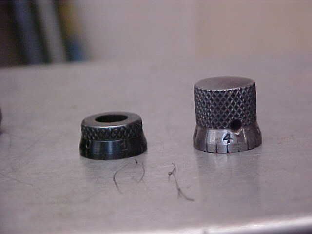 A litle more info. Here's a pic of the 2 main types of prewar elevation knobs. The taller one is the target version and the shorter one has been reblued, the portion with the division lines is always left in the white from Lyman.