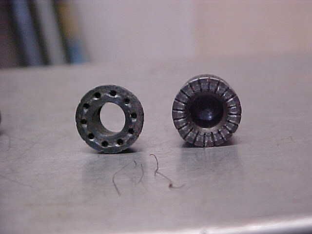 Here's another pic showing the 2 types of elevation click detents. The earlier style is on your left while the later style is on the right. The earlier sights used a spring-loaded ball detent in the main elevation slide that clicked into the holes you see in the knob's bottom. The later sights used a wavy O-spring (2 different sizes!) with internal ears, that clicked into the radial grooves seen in the knob on your right. Both of these styles also used the early elevation screw that was captive at its bottom end.