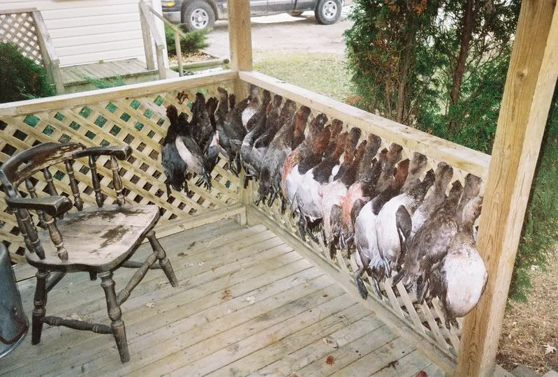 Little better view of the bag without my extra large carcass in the way. Cans on the right and middle, redheads middle left, and broadbill far left. Some of these are from the day before when Don Kaas was shooting with us. Before anybody pipes up and asks, this was in Canada and the canvasback limit is four per day per man so we were well within the limit.