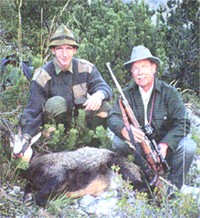 Rado smiled and obviously understood. A minute or two later, with the crosshairs centered low on the buck's chest (the shot was at a relatively steep uphill angle) the little Mauser rifle barked and the gamsbuck staggered then fell and rolled a few yards down the slope. As it turned out, the gamsbuck was a nice trophy, scoring in the Bronze Metal range of 102. Later that morning, Jim Morey bagged another nice animal, but only after a rigorous walk up the challenging slopes. (The Slovenijan Alps are about 6,000 to 7,000 feet elevation, about the same as the high desert plains around Prescott, Arizona.) Following the hunt, we retired to a little chalet at the foot of the mountains as the lengthening shadows moved across the valley. The brief rest before the trip back to Austria offered a unique opportunity to visit with Rado and Sao, learning more about their country and the people. Like most European countries, hunting is somewhat restricted and largely unavailable to the common folk, and it was plainly obvious that Rado and Sao enjoyed the opportunity to share their interest in hunting, guiding and game management. Except for some minor language difficulties, it was almost like being in the Colorado Rockies in pursuit of bighorn. Unfortunately, the wonderful day in the Slovenijan Alps came to an end - pressing schedules are a real pain - and we crossed the border on the journey back to Ferlach.
