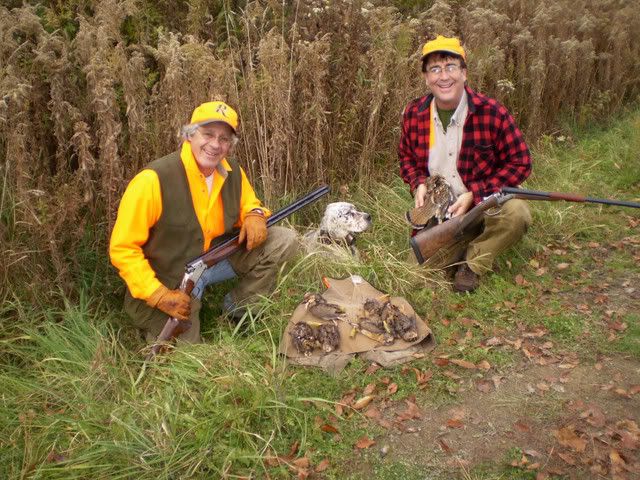 I haven't posted in a long while. My wife informed me that Jeff G had posted a couple of photos of us and I should check out the thread. I'm the more distinguished looking of the two. Jeff is the better shot. In another 15 yrs. he'll be distinguished looking too -- and maybe still be a good shot. Brian, I know you are a Fox fancier. The gun I'm holding in the bottom photo along with the woodcock is a .16 ga. Fox Sterlingworth that I re-stocked myself. It's a nice gun. It's heartening to learn that others have had a good year with woodcock. The numbers in Otsego and Delaware county covers where I do most of my hunting had few of the little birds this year. There has been an alarming fall-off in numbers from the last several years. At least this doesn't seem to be a general trend. Grouse numbers in my covers have been extraordinary. Six to seven birds an hour were commonplace, and while it is never certain some aren't re-flushes, most of these were fresh birds. I would like to post a photo of this year's hunt with Jeff and close friend, Bill C., both of whom brought down three grouse (Mt. Birds) apiece, which I regard as a signal achievement. Each bird is a genuine trophy. To bring home three is special. I may be able to forward the photo to Jeff and have him do it. I shot only blanks, but then I was shooting a .28 ga. I'm thinking of moving up to the big bores like Jeff was using. Like some aborigines, I remain firmly convinced it's the loud BANG that brings them down. Best wishes for a safe return home, Brian. Will