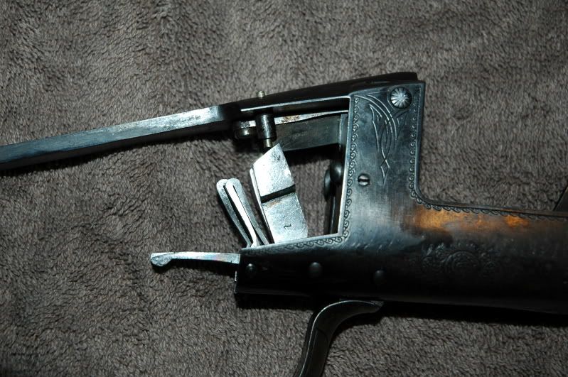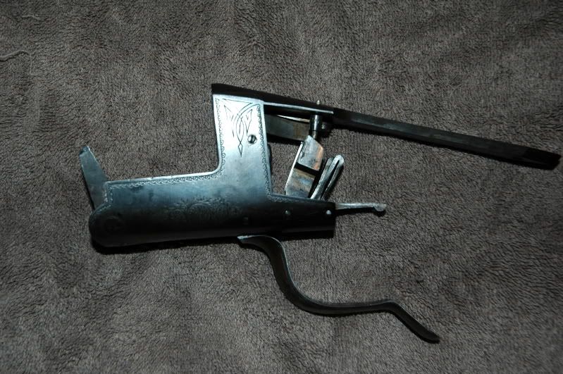 Jeff G.: I can only make a stab at it and it looks like some sort of hybrid. It's set-up like a O/U triggerplate action but the hammers and V springs are on the frame. Very interesting and nice effort. Any additional markings or stamps on the frame or triggerplate? It has a Kersten bolt but is there any additional underlug(Purdey type) lockup? I'd assume that underlever trips something else?
