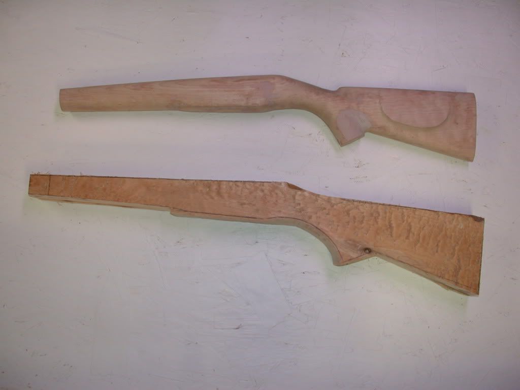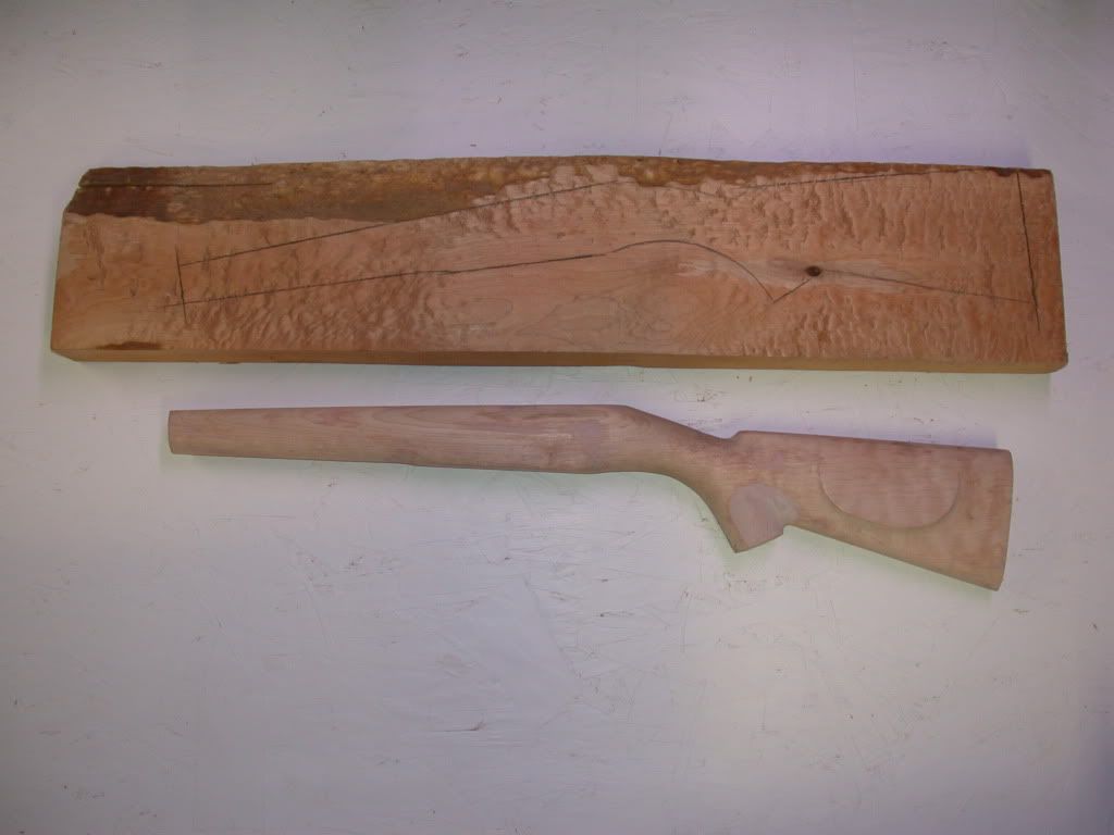I pulled this slab from the firewood pile and decided to make a pattern with a more rearward grip. The first photo below shows the slab with the Mauser pattern stock, the second photo has the slab sawn and ready to go into the duplicator.