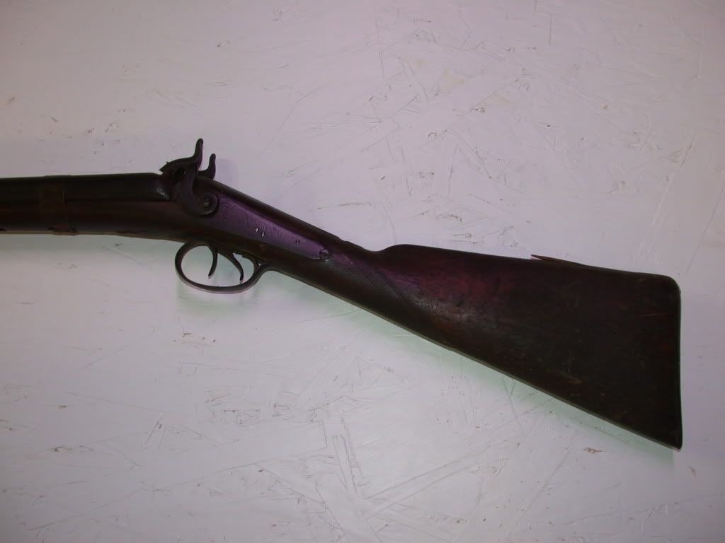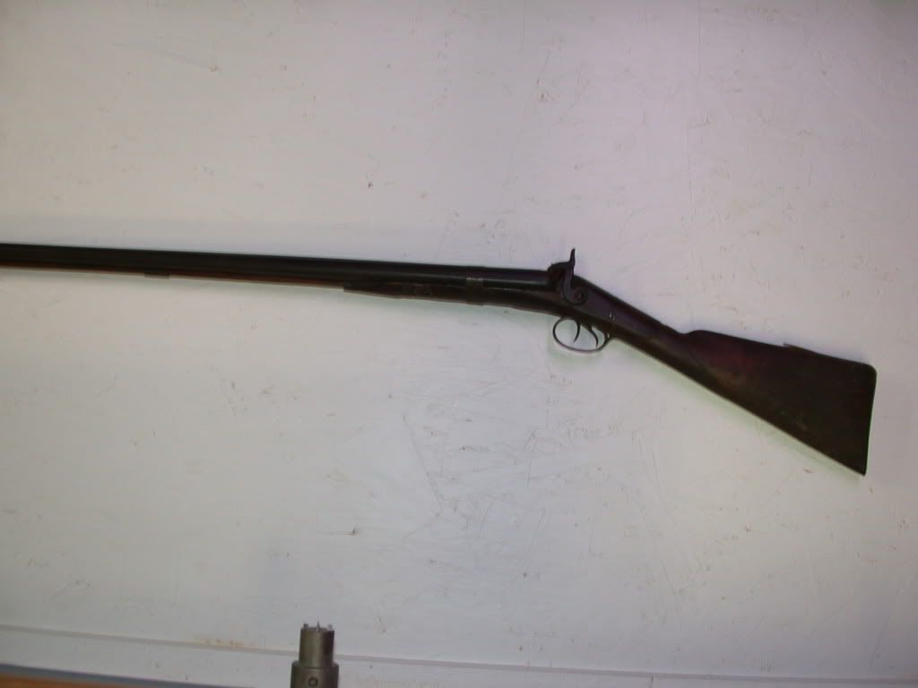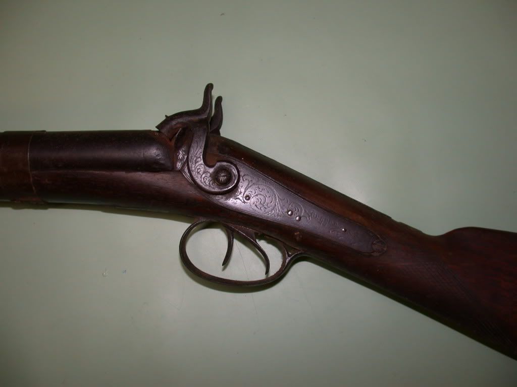 Reading the “Ugly Gun” thread made me think of the wall hanger I have out in the shop. Around 20 years ago a friend gave me this muzzle loading side by side shotgun which he rescued from an old barn that was being taken down. No one knows where it came from, but it is interesting. Each side plate has “Duggan” engraved in a nice script. There is engraving on the side plates, the upper and lower tang, the trigger guard and the hammers. Notice the back woods repairs. This gun is in restorable condition. Barrels appear to be steel. About 1/2" from the end of the barrels the bores are right barrel 0.658" and left barrel 0.648". Balance point is 7 inches in front of the trigger guard. With my hand at the front of the forend, the gun balances nicely.