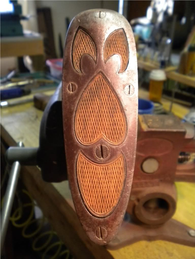 As is customary for me, I'm late to the party. I went to church, so there!  The skeleton damascus plate on Glenn's rifle was done with a false insert to cover large holes bored in the buttstock. These holes were bored for recoil reducers which added weight and helped reduce recoil over a long day of shooting. I've done skeleton butt plates using the false insert and inletting them to the native wood. Both are very time consuming but the native version is the most difficult because you only get ONE chance to do it right. I'm kind'a hoping that Glenn gets busy and makes some more plates real soon because I need at least one more for current projects. Glenn thats your clue the world is waiting.  I believe that I posted this picture before, but for those that have not seen it here it is. This is the skeleton butt plate from a "C" grade Nichols & Lefever that I own. The wood has shrunk over the last 120 or so years but this is true insanity.
