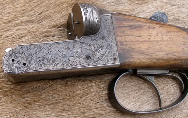 Sidelock - A type of action on a break-open gun where the lockwork (hammer, sear, mainspring etc) is mounted to the back side (inside) of a plate (or pair of plates for a double gun). A sidelock is superior to a boxlock because: 1. Less steel needs be removed from the bar of the action; the action is therefore stronger. 2. The lock plates provide a larger canvas for the engraver's art. 3. Sidelocks have generally been considered a more aesthetically pleasing form. 4. They are often made with secondary, or intercepting, safety sears. 5. Trigger pulls theoretically may be adjusted more precisely. 6. Because of all the above, most makers building a range of guns have usually reserved the sidelock action for their better grades of guns; this last being the most relevant reason why sidelocks are generally considered superior to boxlocks. Photo