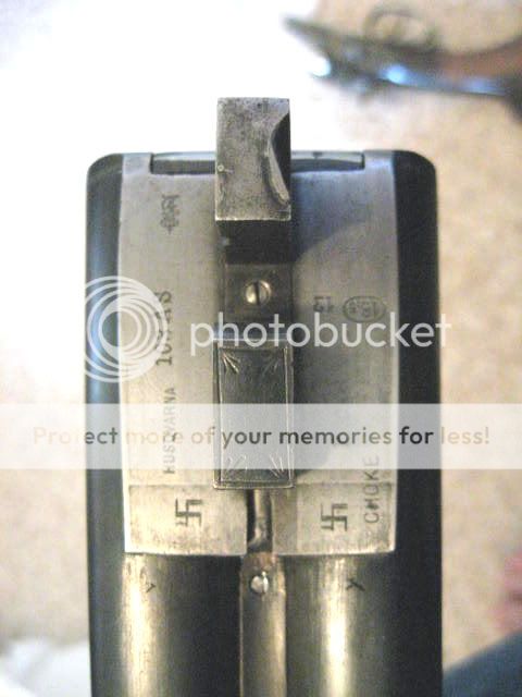 There is a book (in Swedish only) about Husqvarna shotgun manufacturing between 1877-1977. The information it gives about the markings on this barrel says that the swastika is a “steel quality label, company label, which was abandoned during WW2” (The Sandvik name is not provided). The stamp in the upper left corner is the pressure proof mark. The “P” is the mark of the assembler, Carl Petterson. He was active between 1902-1955. 18,5 means 18.5 mm bore diameter before the choke. The word “CHOKE” means that the choke is full. The model 103AS is pretty rare; only about 700 were made.