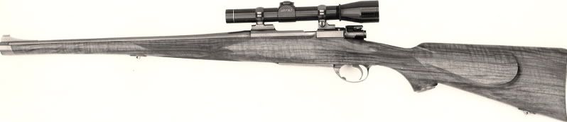 A friend has been reading this thread and ask me to post the following. "It's a small ring Mexican stocked in English walnut by Don Klein with metalwork by Don Klein and Herman Waldron. The engraving is by Dan Goodwin and is chambered for 7X57 Mauser with an 18 1/2" barrel. I had it built in the about 1984."  Nice! I especially like the shorter barrel and slimmer forestock. One reason that the Mannlicher-Schoenauer carbines look so good is that they don't need a lot of wood ahead of the rear of the magazine since the rear face is the recoil surface; this means that the M-S forestock area can be made thinner and more tapered than most other bolt rifles without sacrificing necessary strength and so results in a dainty and petite rifle. IMO a Swift needs a longer 24"-26" barrel (velocity) and a mannlicher-style stock needs a shorter 16.5"-20" barrel (aesthetics). JMO. Regards, Joe