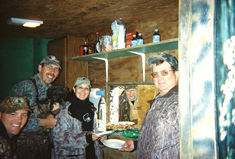 Some Southern Illinois friends in their duck blind, yes that's a duck blind believe it or not. They're serving hot cinnamon rolls and coffee to my Father out the window. Them boys know how to live!