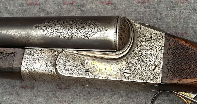 Its a very interesting pattern & even type of scroll. I also think the treatment of the frame's angle reinforcement is quite tasteful. What does it look like on it's underside? It would appear the gun has seen plenty of honest carry use in its 104 year lifespan, but obviously also been pretty well cared for. Thanks for sharing the pic. The pointer looks like a real hunter too, not carved by someone who sort of thought they knew what one might look like; notice his muzzle/head configuration is a bit more blocky than some of today's dogs & the stance is not so stylish, but I'd bet it was a very accurate & detailed depiction of a real pointer at the time it was engraved. Looking at the vegetation one might even imagine he was hunting somewhere in the Carolinas. Well, at least some coastal area when quail were still plentiful in the east.