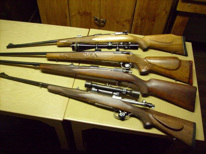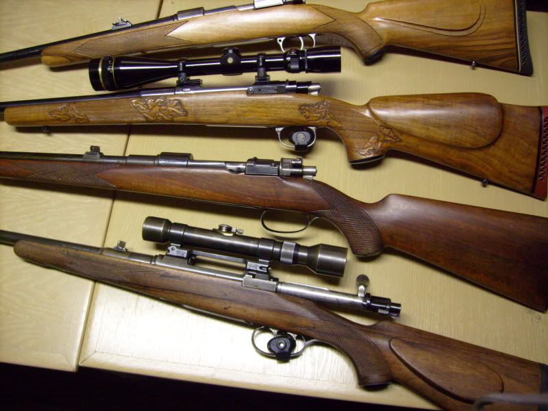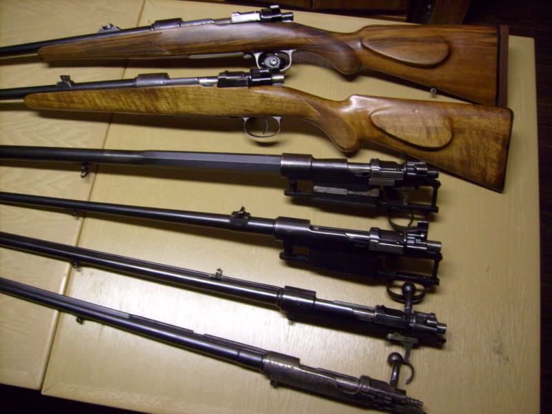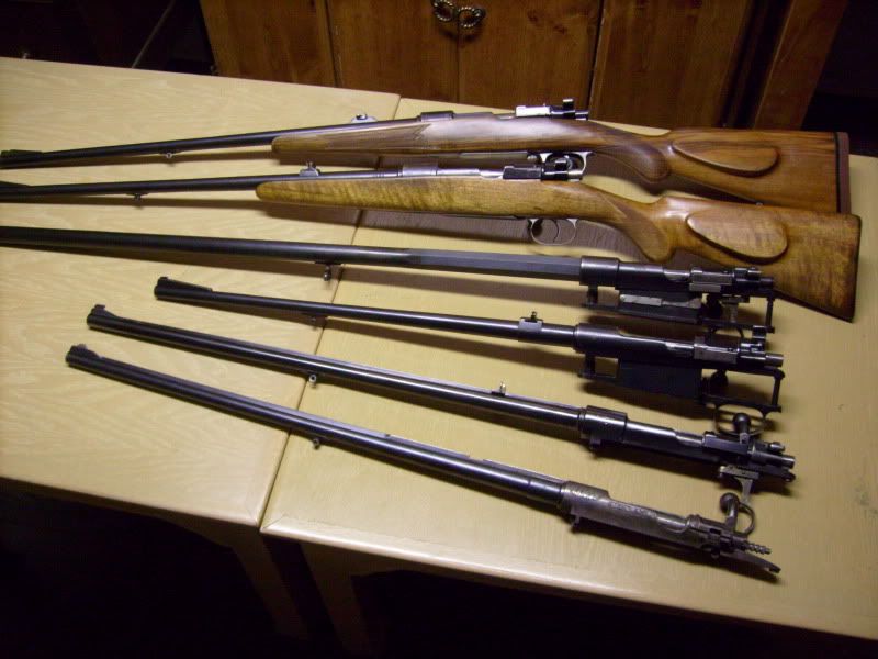 The pics. need some explaining, starting at the top. #1- C&H in 30-06 with a 2 groove barrel, #2 - FN Supreme small ring in 6mm with a Douglas Sr. premium barrel, Herter's stock, all the stock work was by me some 40 years ago, #3 - Unknown 98 in 8x57 with a 26" military barrel, #4 - A 21 H Brno in 7x57 with a "factory" scope, #5 - I. Merfert in 8x57, #6 - Unknown 98 in 8x57, A 98 Remo with a custom 16 gau. slug barrel, #7 A Geco small ring in 8x57, the last two are Unknown, both have full lenght ribs, the small ring on the bottom is all engraved. Hope to have the stocks for the last 4 re-done this winter. --- John Can.