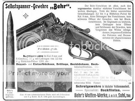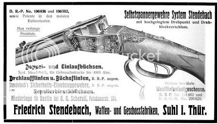 Gustav Kersten of Strassburg - http://www.germanguns.com/questions.html , Karl Friedrich Phillip Stendebach(Fr. Stendebach, Waffen und Geschossfabrik) - http://www.google.com/patents?id=xnBkAAA...p;q&f=false , August/Richard Schüler Herkules-Doppelbüchse DRs surface from time to time for sale with their unique lockups and all were an attempt to address the strength of the evolving Nitro powders. In almost all cases these designers subed the bulk of the task to master mechanics and the retailers may have added some final embellishment.