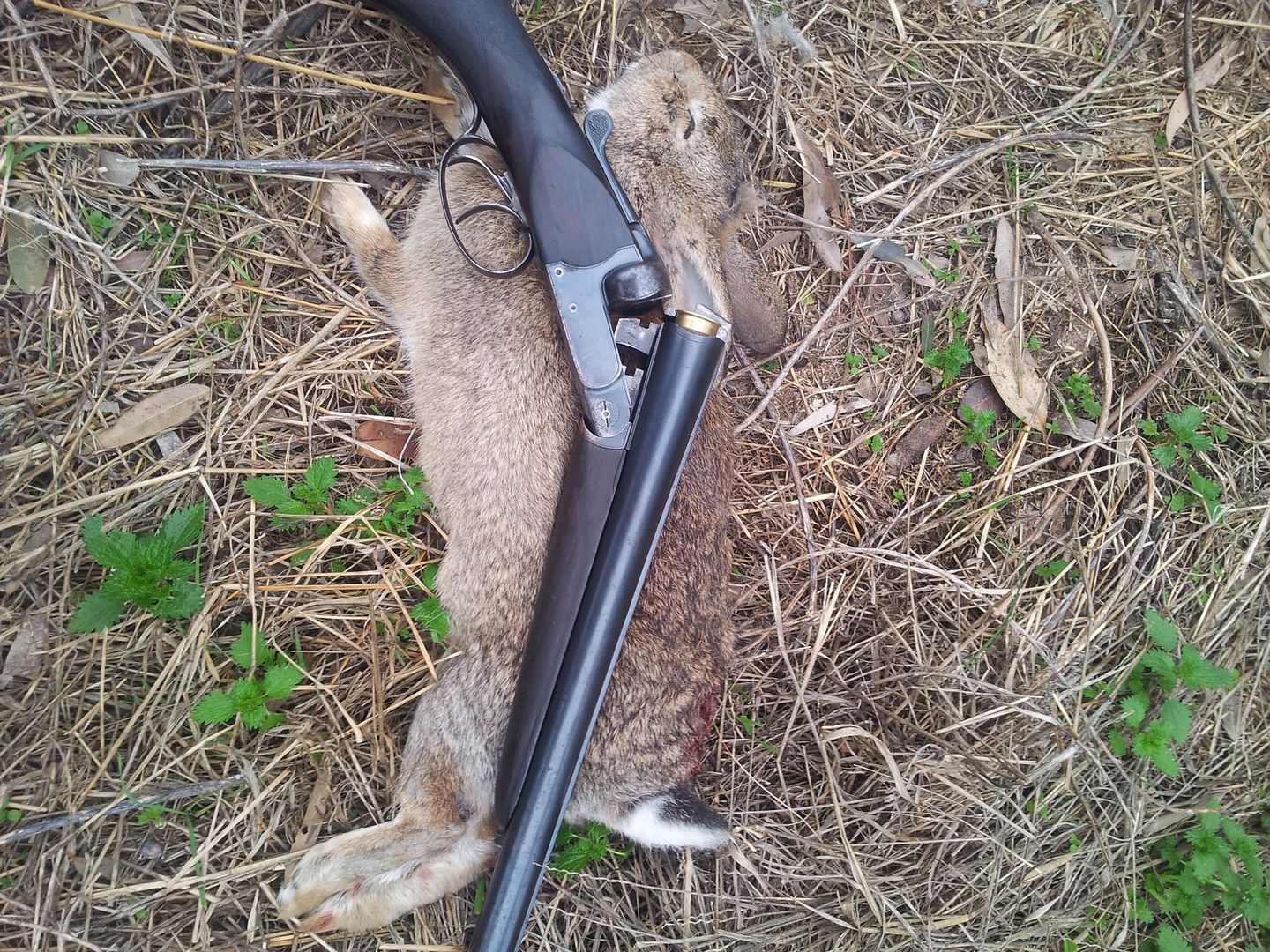In this paddock there were several clumps of African box thorn. It offers rabbits good physical and visual protection. Wherever you see a clump of box thorn you will generally find a rabbit warren. I stalked up on these ones, the dry grass didnt help and the time past 9am was really too late, luckily it was an overcast day and still cool. I saw several white tails as they slipped into burrows, but one was a little slow and as the rear half disappeared behind a tree it was collected by No 4 shot. So I finished him off, but because he was only 8 meters away it destroyed the meat, so I didnt use him.
