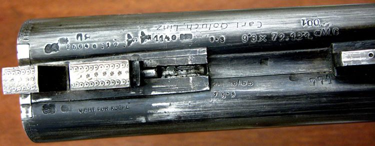 There is another set of numbers on the rib ahead of the forearm hook 7136.12.15'8. 8'4 I have used the apostrophy for their raised decimal point (assuming that is what it is). It is a hammer gun. I thought the 12.1 gM.G. following the 9.3x72 meant 12.1 gram metal jacket bullet as the service load.