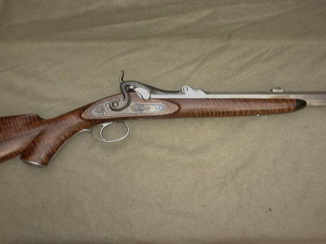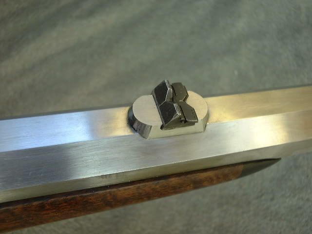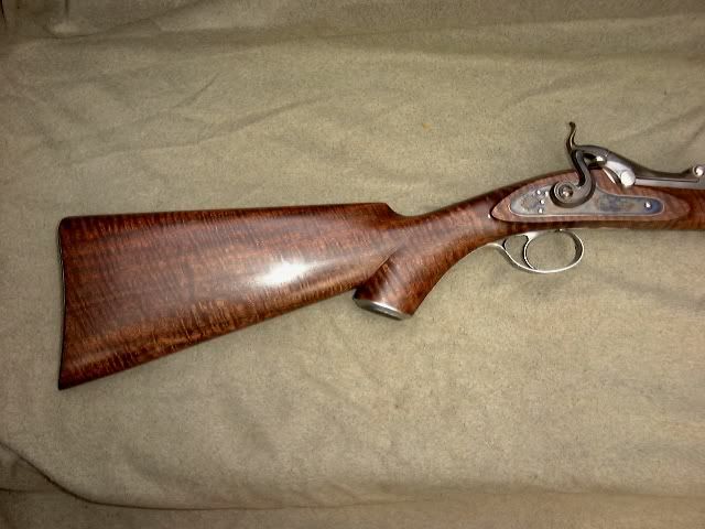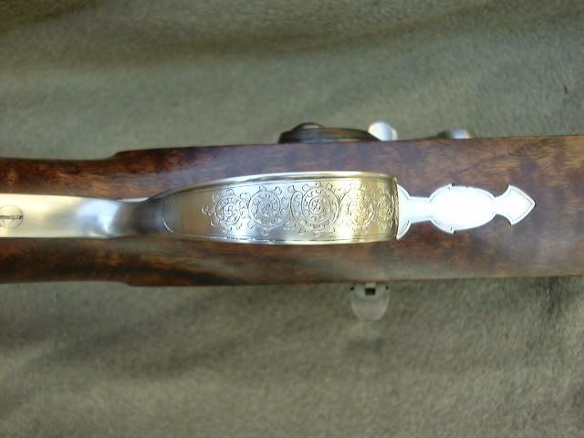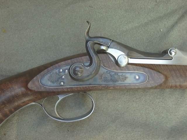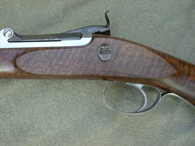 This project is winding down with checkering and rust bluing yet to be completed. About 6 months back, a few asked to see pictures of additional work. I decided to raise the sighting plane a bit by using bases for the sights. A couple of earlier guns had the sights mounted on the barrel and the sighting notch in the action was a distraction of sorts there. The front sight was in a box of old sights so I decided to use it. The trigger guard came from a friend in England, it was made for a 20ga. Greener shotgun. The rolled edge is perhaps a bit odd for a rifle but the overall shape was close. The 'off side' lock panel shows a hinged lock bolt...I saw one of these years ago on an British percussion match rifle. The breech block hinge pin has a matching screw on the opposite end. This eliminates the locking arm of the original breech pin. Roger Sampson did the modest engraving and Keith Kilby at Wyoming Armory did the color hardening.