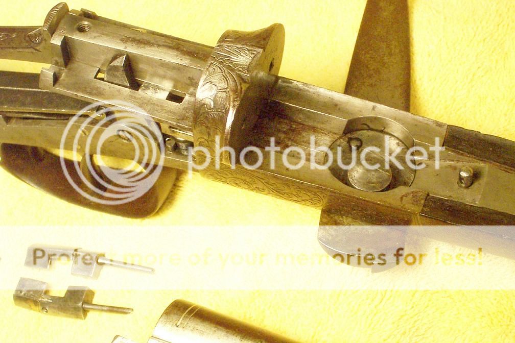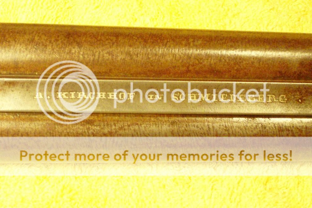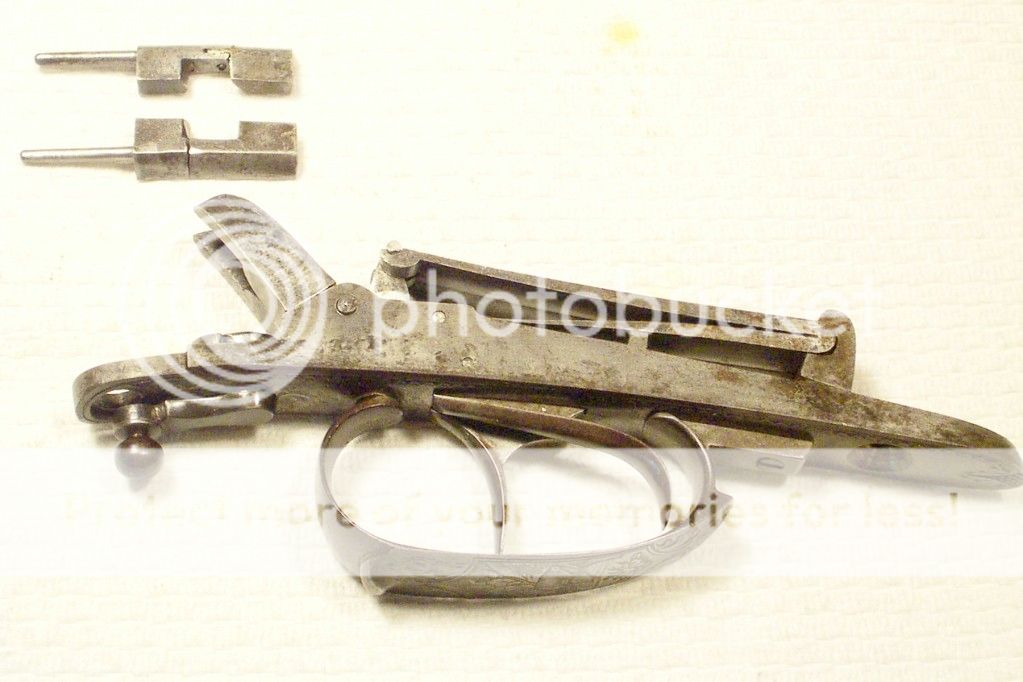Kirchhof combined the G-B-T-C slide and tilt action with the "Leue&Timpe" lockwork and added a hammerblock safety apparently of his own design, activated by a small crank in front of the triggerguard. He was not alone in making "improved" slide-and-tilt actioned guns in northern and northeastern Germany. F.i. both Kief and Westphal in Peine , though both outlets for Teschner too, offered their own "improved" guns with different safety arrangements. I have also seen a "Teschner-Collath" lookalike by another gunsmith, but with coilspring striker locks inside, and a shotgun by G.L.Rasch in Brunswick with a Lefaucheux breech action and Teschner's triggerplate locks and wing-nut safety. So the possible variation and recombinations are endless. Remember, the rough Damascus barrels were mostly imported then from Belgium anyhow and all other parts of a gun were hand-filed from very rough forgings. Any village blacksmith then was capable of producing such forgings and a shop employing a dozen gunsmithes like Kief's or Störmer's was certainly capable to make such guns.