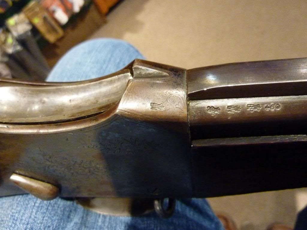 Also looks like a London Proof House 'Final Proof' (BP) mark there too on the bbl closest to the frame. Guessing it was proofed at London origianly and went to Birmingham for re-proof after some work performed at a later time.,,maybe a conversion to 450 from ??