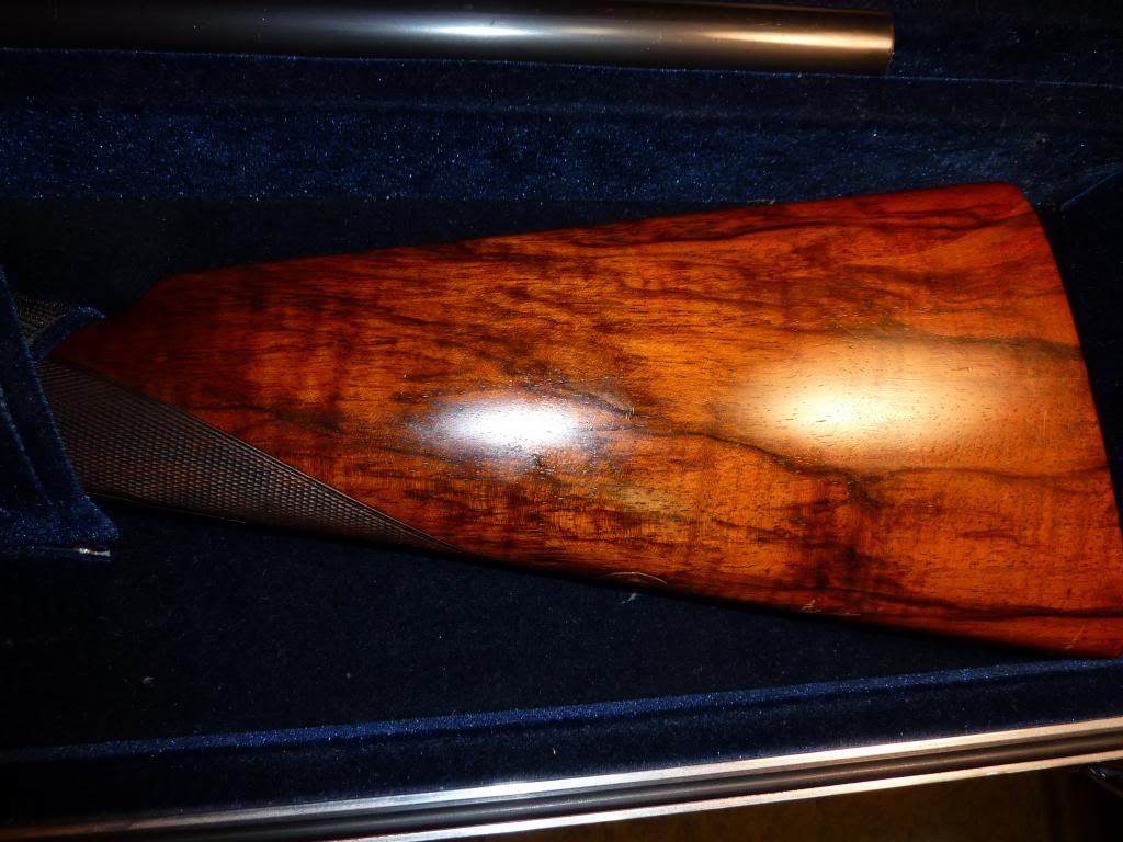 The barrels came back today from Mr. Merrington. They measure at .025" where the dent was just as he said. The engraving looks great though I do not know who he sent them to for that part of it and the reblacking looks perfect to me. I am ecstatic with the job and very pleased to get them back so soon. I will add some pics of the barrels later but here are a few of the action and wood.