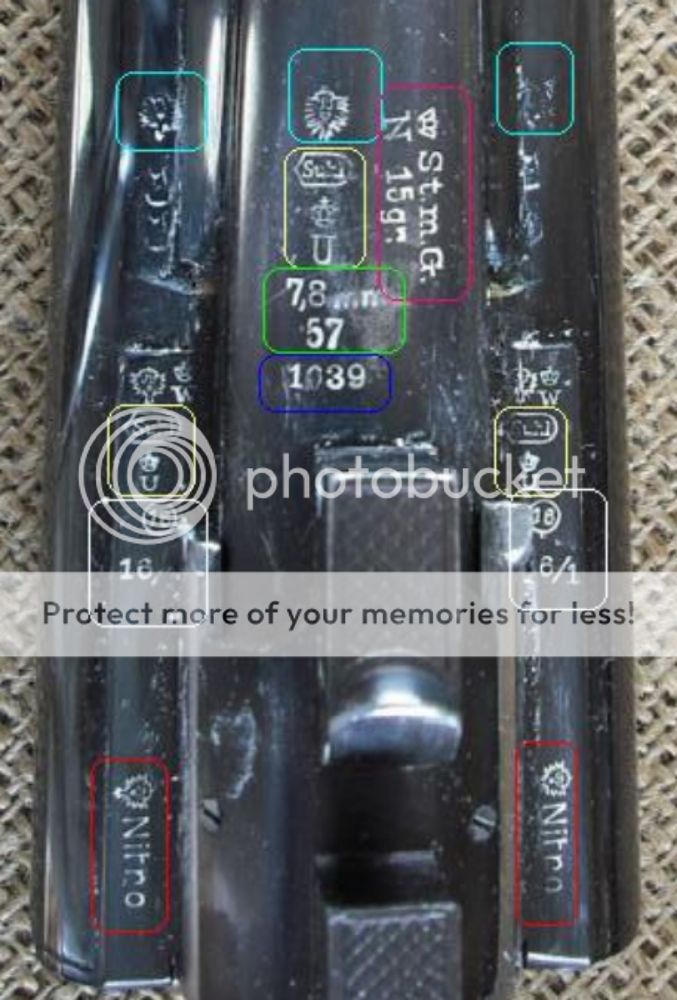 So you want to know about ALL the proofmarks, correct? I guess it would be better to maybe highlight each mark in a different colour for emphasis? Do note that this sporting weapon experienced proof between the 7th of June, 1939, when the new proof law was published and April Fool's Day 1940 and June 1st 1940 for the Sudetne Protectorate, a very interesting area.