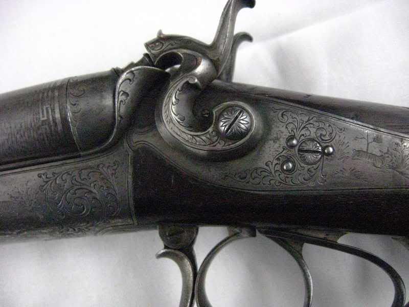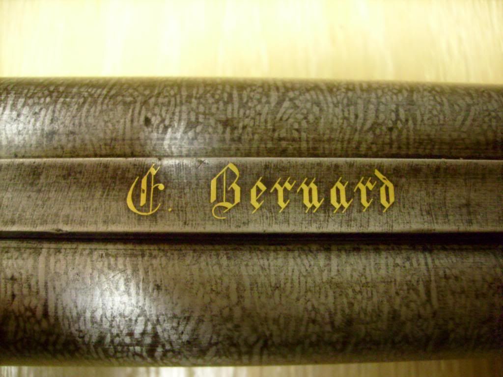 Hi guys, This is an E. Bernard gun, not a Leopold Bernard. E probably stands for Ernest. He was in Liege. He had 2 patents which concurs to the "Brevete" (i.e. patent holder) mark on the barrel. The gun was retailed before 1870-71, after which Strasbourg became German. Accordingly to the general time frame, the locks are non rebounding. It's quite nice actually. Centerfire guns were not that common at that time. There is some writing on the bottom rib. Can't make it out xbayexxx???. Best regards, WC-