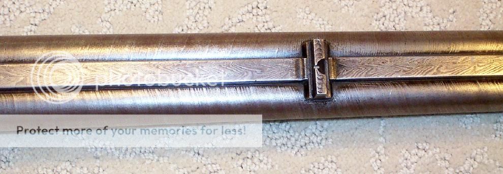 The barrels are twist, but it is the breeches that have my interest. The shot barrel breech is flat across the end of the threaded plug, with a hole in the center that communicates with the flash hole in the nipple. The rifle barrel plug, however, is hollow back to the end of the barrel It then has a conical post, 1 3/8 inches long, on the center of the bore, with a hole from the tip of the cone back to the flash hole of the nipple.