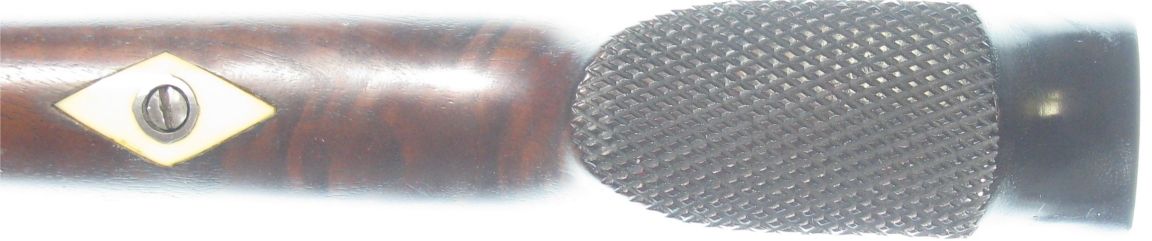 The checkered palm rest made as part of the forearm is quite unique as is the genuine ivory screw escutcheon. I hope these will help to identify the stock maker.
