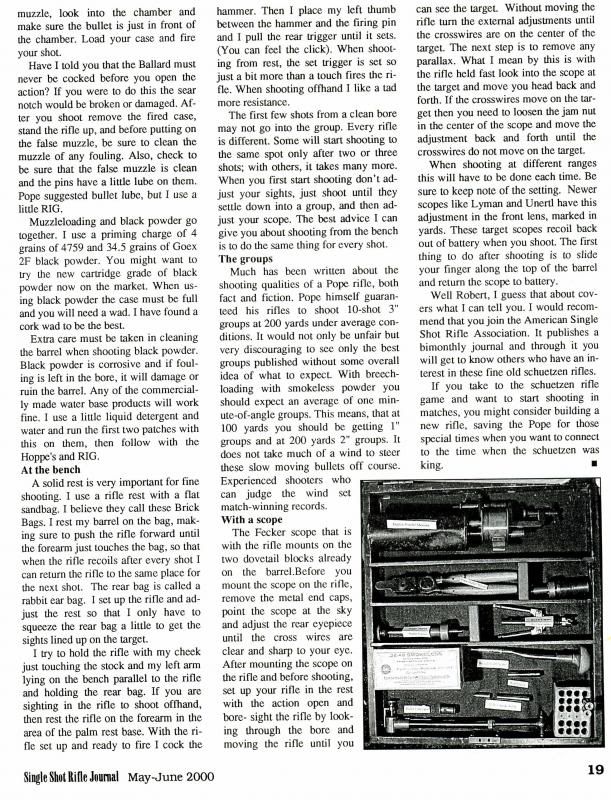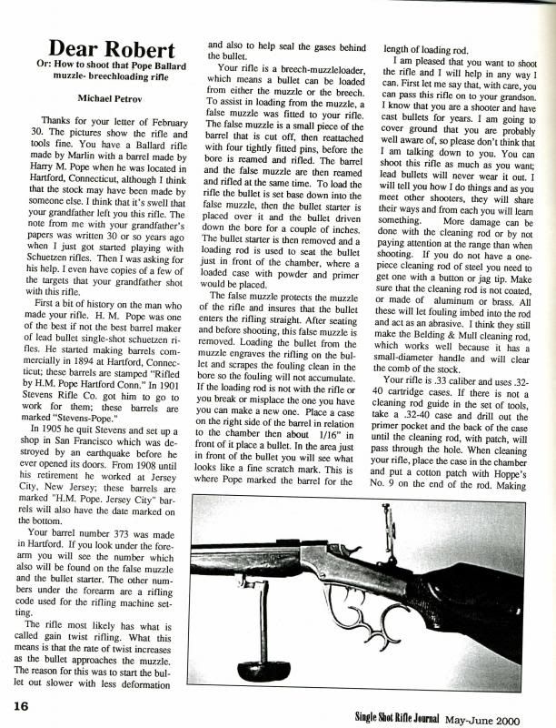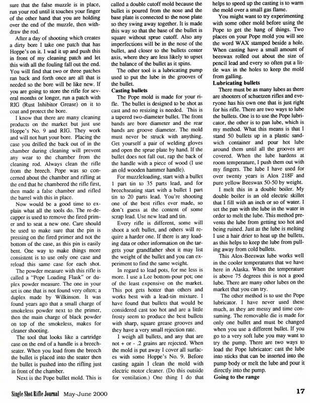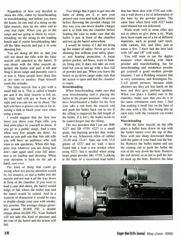 I don't want to take way from the good Neidner Stuff so just have a few questions to those that have breech seated. I just started shooting a highwall with a Stevens-Pope barrel (later than Harry) and was wondering If I need a different mould? The Pope style bullet does not engrave on the 1st 3 bands but does engrave the last 3 and slides in rather easily. What do you fellows that have breech seated look for in a proper fitting bullet? Should I get a mould that has all bands engraving?