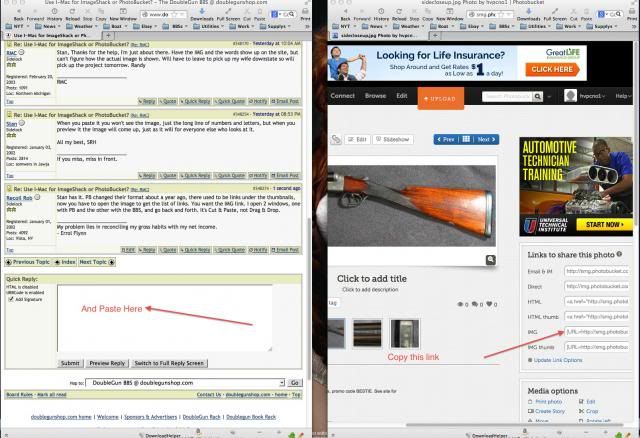 Stan has it. PB changed their format about a year ago, there used to be links under the thumbnails, now you have to open the image to get the list of links. You want the IMG link. I open 2 windows, one with PB and the other with the BBS, and go back and forth. It's Cut & Paste, not Drag & Drop.