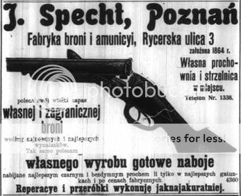 Rusznikarz/gunsmith J.(Jan?) Specht hung out his gunmaking shingle as J. SPECHT Fabryka broni i amunicyi in 1861 at Wielko Rycerska 6/7(Größe Ritterstraße 6/7) in Poznan till around 1872 when he moved down the street to Wielko Rycerska 8(Größe Ritterstraße 8) where he stayed until the mid 1880s. In the last decade of the 19th Century he was located at Rycerska 3(Ritterstraße 3) where his successor( nastepca wlaczone) J.K. Chmielewski acquired the business circa WWI. Just a guess, but it is highly possible that this was his son-in-law. At this juncture the shingle read J.SPECHT nastepca wlaczone J.K. Chmielewski till WWII at Franciszka Ratajczaka 3, which appears to be the same location but a name change was made post WWI.  J. Specht in Poznan Courtesy of Piotr J. Bochynski - The advert seems to indicate a founding of 1864? Kind Regards, Raimey rse