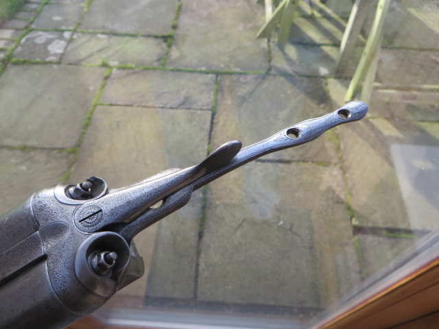 However one interesting feature is the top tang. This has been extended and an additional screw has been used. Judging by the engraving, this was done before original sale but to what end, we will never know.