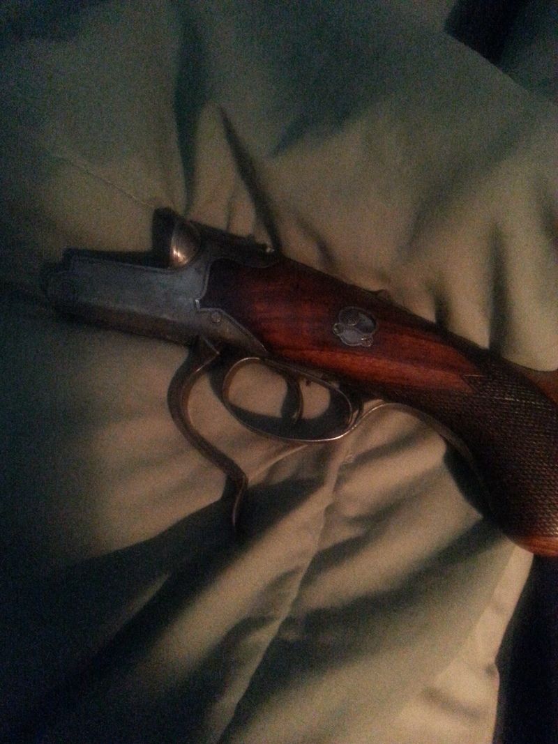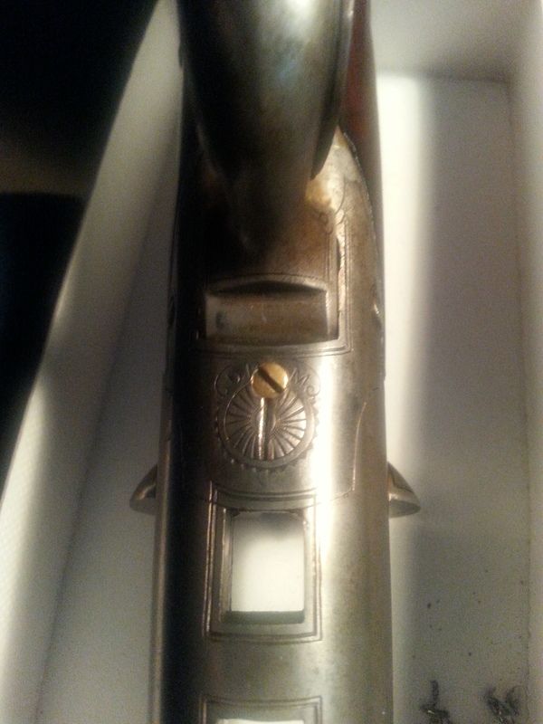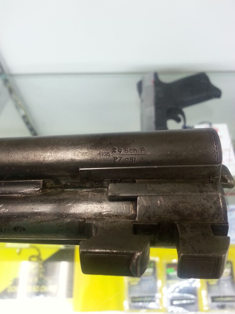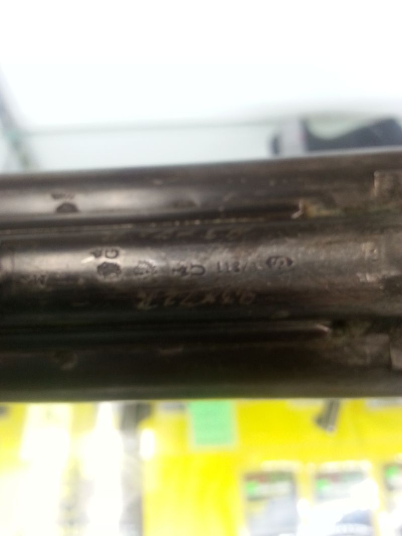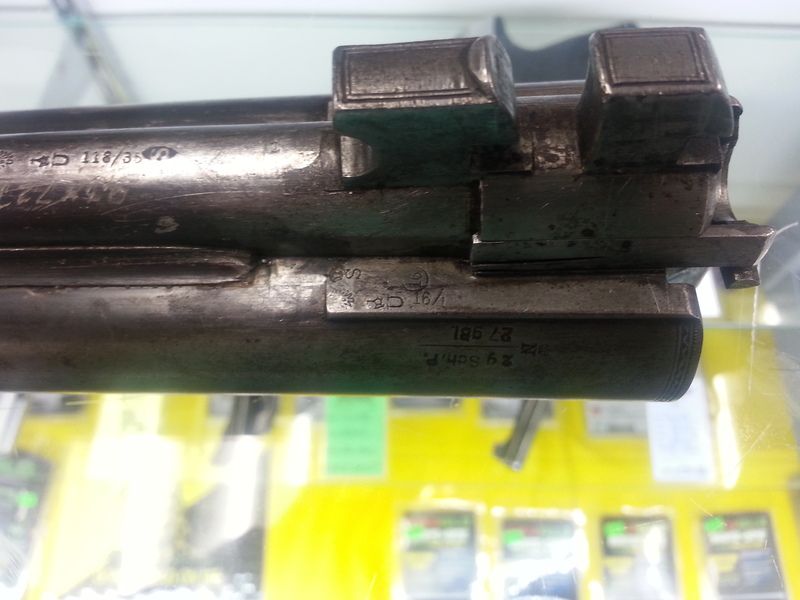 Under shotgun barrels are stamped with your expected 16 ga proof marks, nitro proofed, R barrel is cylinder bore (crown over S), left is choke (crown over W)Both stamped 2g Sch. P. over 27 gBI.