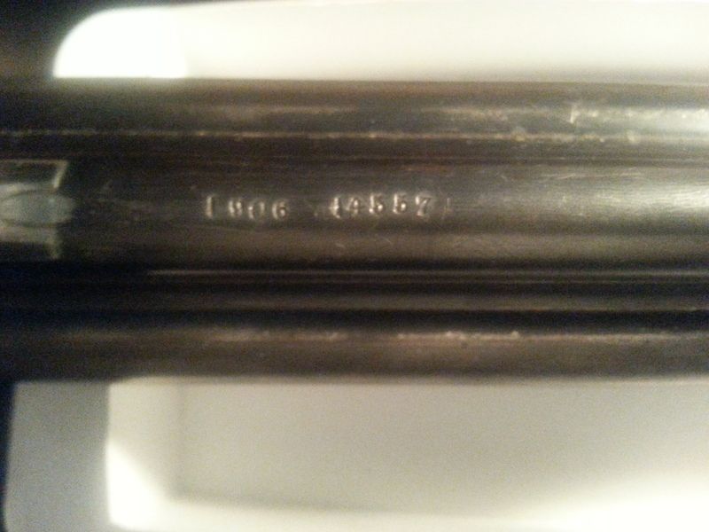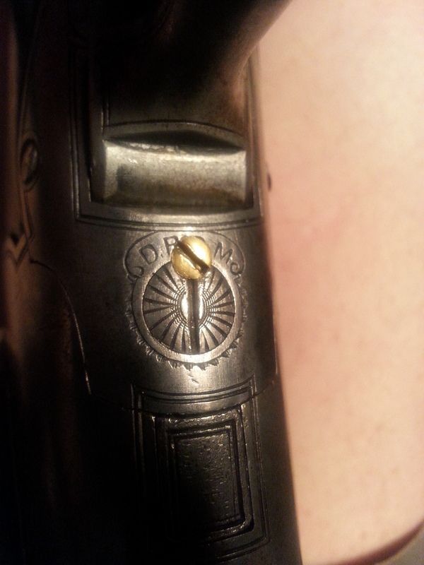 Action is an under lever, with the somewhat common in my searching, three silver pin cocking indicators, light engraving with a post WWII repair screw going right though a four letter crest beginning with D P ? M.