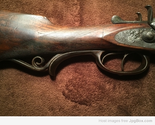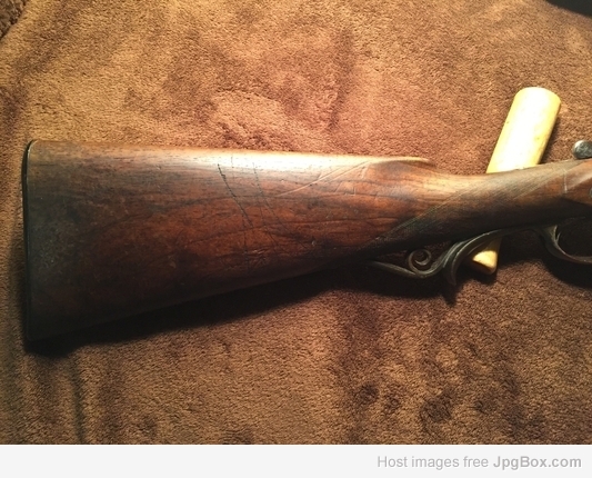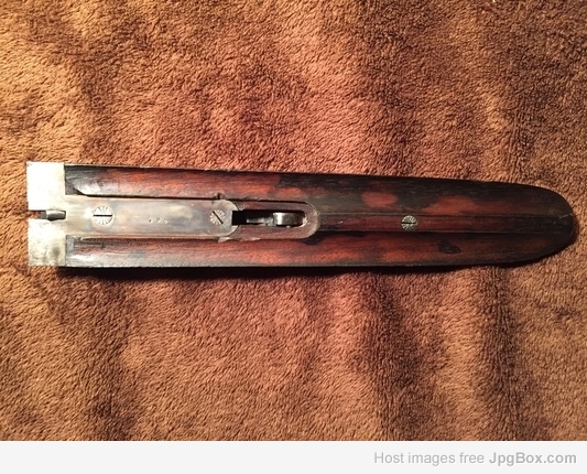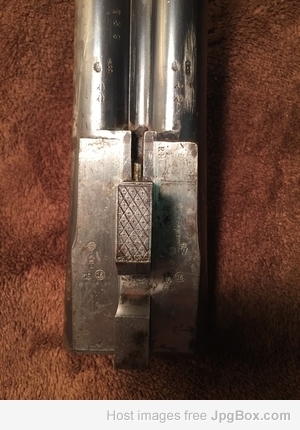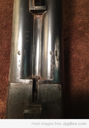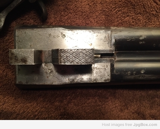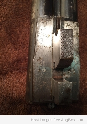 Good evening Forum members. I received my hammer Ed Kettner 16Ga today. I have posted pics of the action, barrel flats, and the gun below. Any information you can provide based on the proof marks (date manufactured, etc.) would be greatly appreciated. The barrels ring true and although the bores are a little rough, they are very good for the most part. Judging from the end of the barrels and their thickness, it is probably choked full of extra full. The blueing is worn in a few areas and there are some light rust spots, but I think they can be cleaned up. There used to be sling swivels on the barrels and stock, but they have been removed. The gun seems to lock up tight but the top level does not return to the middle by itself. It seems the spring is broken. The rebounding hammers are low profile with stout springs. They seem to work well, although I think the left one needs a bit of attention (cleaning for sure). The horn trigger guard also needs some attention. The butt plate is also horn and the victim of a bug/moth attack, but I think it can also be repaired. The stock and forend checking is fine, but very worn. The stock seems to be sound with no cracks, but has a lot of scratches. However, it does seem to have some nice figure. If it were you, would you just do a service repair (strip & clean, open the chokes to be suitable for hunting and sporting clays, and fix any mechanical issues) or do a full restoration (re-blue barrels, refinish wood and recut checkering, repair horn trigger guard and butt plate) in addition to service repair? I realize that continental guns don't hold/appreciate their value as English guns do. BillK