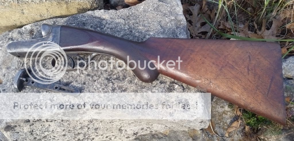 Here is the Bonehill I got with the 3 gun treasure. It's missing the safety parts, the forend wood and latch and buttplate. I have what's left of the barrels. They have been stubbed off and new tubes welded in. He rumaged around and handed me a metal buttplate that he said went with it but doesn't.