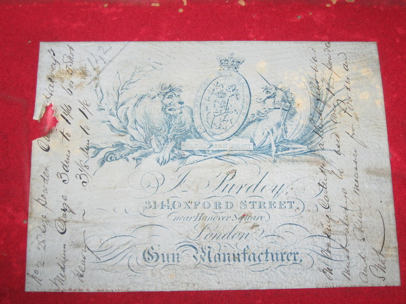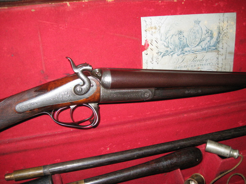 Thanks a lot for the photos. They inspired a lot of thoughts. My research so far indicates the Purdey barrel marks normally appear on the barrel flats in front of the hook like your pictures show. A "JP" indicates the barrels were finished by Purdey. Other letters denote other people finished the barrels. Other barrels not finished by Purdey were rare in 1869 when my gun was built. As I am finding out nothing is that straight forward on old Purdey guns. My gun has no marks-see photos below. I contacted Donald Dallas about this and he said no marks were not usual. The barrel marks denote who finished the barrels-not who made the damascus forgings. Purdey got their damascus forgings from the best suppliers available-usually from England and most likely Belgium. I sent a few pictures of my gun with its original case with the Purdey label marked 8142-the gun serial number. As far as I know all the major parts are original. I'll know more about what modifications have been made over time when I receive the original build specs from Purdey. As someone responded to my post the real fun is learning what you can about these old masterpieces! The search continues! Thanks to everyone who responded to this past! In the case a powder measure, an adjustable shot measure, original cleaning rod and a bore bush with rope were included. Sorry no pictures. I'll try to figure out how to attach pictures.