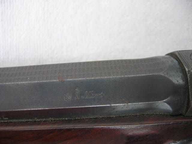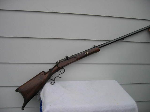 Interesting the gun is marked with the Crown/B indicating it only went through the definitive proof after finished. Usually seen on guns imported to Germany during that period from areas without a recognized proof system. It just appeared to me to have some Swiss flavor to the triggerguard and butt plate-but that is an just a gut feeling, not substantiated by any means. Sort of an obscure cartridge which won't help it for resale. Appears to be setup for offhand target with a fairly mild cartridge, hook butt plate, set triggers, extreme trigger guard etc. On the full length photo there seems to be a protrusion midpoint on the top of the wrist, is that a possible sightbase for a tang sight? Also appears to have a dovetail rail on the barrel? I have seen that 3/4 oval with the MI before, but having trouble finding it in my files again. I will keep looking.