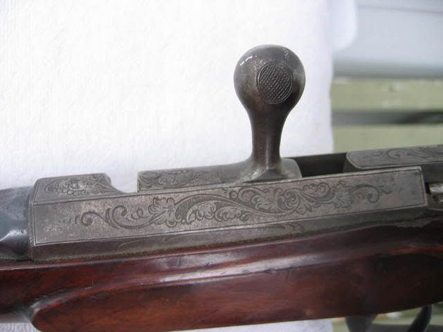 Raimey: If you look at the picture that shows the top view of the bolt action, you will see the screws. There are two screws just behind where the bolt slides back. It also has a square-looking opening between these screws. I figure there must have been another sight there? I can't make out some of the letters either. By the way, he's asking me $1,000; and I don't have any idea if the gun is worth that, would make a good trading gun later or be a worthwhile investment. I do appreciate all your help on this. George
