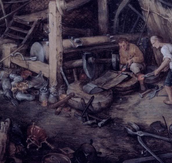 Which became this water wheel powered hammer, circa 1650 Jan Brueghel the Younger, Venus at the forge of Vulcan.