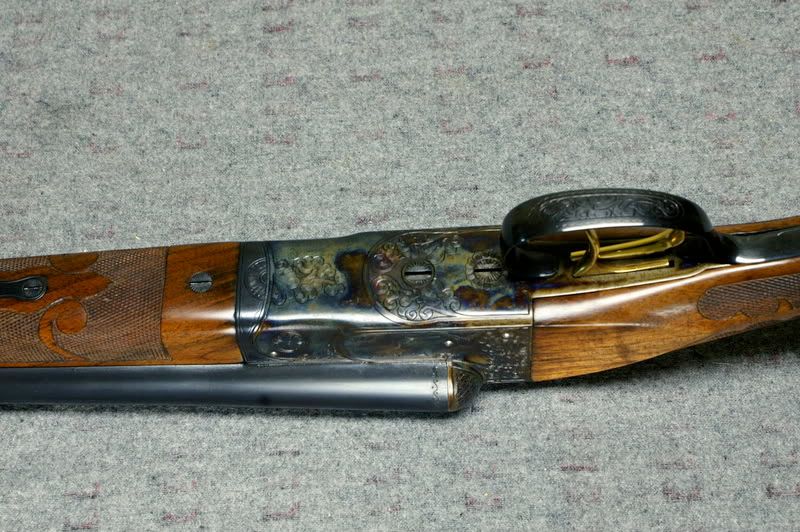 Mike, Original wood. Gunter did all except the case coloring and re-touching the barrel engraving. The barrels had a good deposit of rust and Gunter had to do a lot of polishing. Thus the need to re-do the barrel engraving. In retrospect, the barrels on graded guns did not have