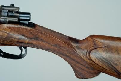 Michael, Terry and Daryl ought to be able to add perspective to this one, eh? Welcome Brad, jump right in! Brent, I appreciate your honesty about finances, I have difficulty with those that say, " I would never own that expensive gun, too pretty to take hunting." When they really mean, " There's no way in the world I could afford to own that gun so I could make the choice to shoot or not." I'd figure that Ottmar rifle (shown above and below) at about $8000 give or take, being one of his high quality hunting rifles. As a 7x57 weighing about 7 lbs. and extremely well balanced, it begs to be shot at something running (which I never do). Maurice was extremely versitile and prolific of a span of some 30(+-) years in the trade. (He was also one of the nicest and well liked of any man I've known.) His quality had peaks and valleys, but this is a small ring commercial Mauser action that hasn't been drilled for a scope has nickel silver skeleton buttplate & grip cap, a great piece of possibly genuine French walnut, light engraving by Roger Kerr and very high quality workmanship. Probably made in the '80's so not an antique nor even very old, but deceased maker for what that's worth?!? Certainly a worthy collectable but it would be irresistable for me to shoot, If I could afford to own it! Which I can't. As for quantity, what I meant was that while I probably don't own many more guns than you, I own enough that I have several just because I like them with no real intension of ever shooting them. I work full-time in the shop so things like casting bullet, extensive handloading or case making are not hobbies for me, I'd rather get outdoors. Ken, You've got a great perspective and I've a few of those guns. (BTW, this topic may be used for my next Shooting Sportsman column, but if I quote I will either do it anonymously or ask permission.) Thanks, Steve