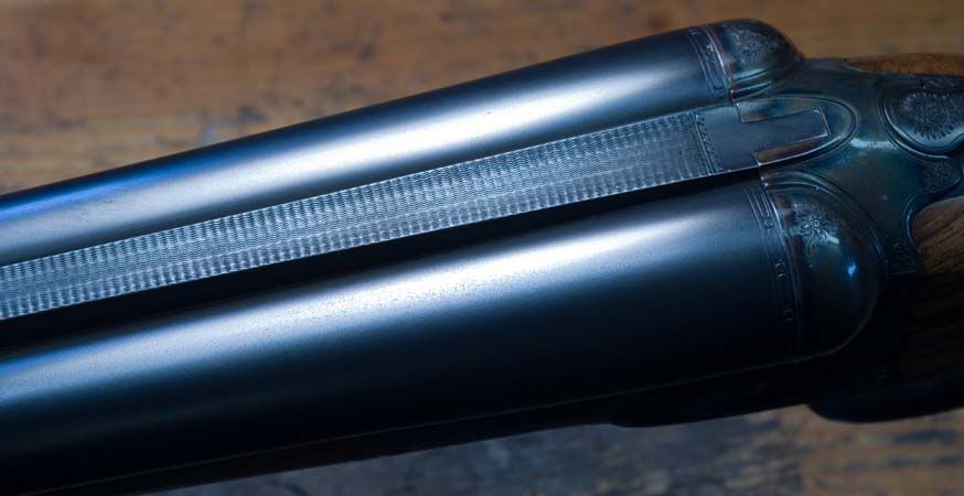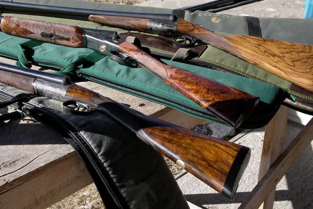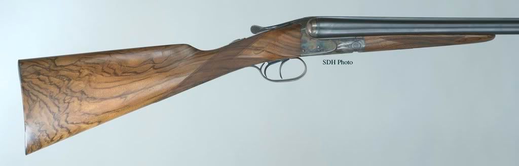 The original custom Fox. When I started this project (1989) there was no one to ask, no precedent (other than Burt Becker) and no right or wrong, I did exactly what would please me. At that time all my welding was gas welding and the though of welding on a shotgun barrel was absolutely out of the question (I still don't think it a particularly good idea) There were no qualms about filing off any factory markings, the Fox signature arrowhead-frame shaping was removed, in fact I wanted it to look English enough to confuse folks, and Eric Gold engraved Hughes/Fox at my request. (The engraving cost about five times more than the price of the project gun, but who can afford Eric's engraving today?!)  If you look closely: my rust blue is a bit grainier than I would do today, there is one hint of a scratch not removed from filing off the roll marks on the top of the right barrel, and you can probably see where they were in the elongated highlight. The case colors have faded and disappeared after the laquer over them wore away as has the trigger guard bluing. She has held up well (with rejointing by Dennis Potter) and I learned more about how guns, and there finishes hold up by actual usage. All in all, it's very pleasing to have owned and shot a gun for 20 years! A couple decades later, the gun is well worn from shooting and bird hunting in five western states. I've shot thousands of rounds AT clay targets, and it is pictured here with Daryl's Dickson and custom M-21 a couple of weeks ago in out shooting Montana March sunshine. Starting over toay, I'd do a few hings different, but not much, except shoot it more! Best, Steve