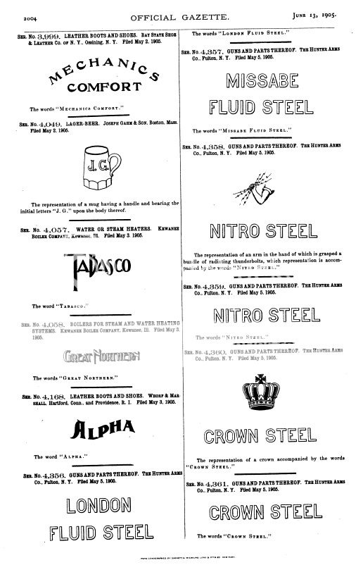 All right. Let me do some digging as to who sought this protection on May 5th, 1905 & why:  Hunter Arms Company, Fulton, NY London Fluid Steel Missabe Fluid Steel Nitro Steel with & without Arm in Dexter with lightening bolts Crown Steel with & without Crown Add L.C. Smith & Hunter Kind Regards, Raimey rse